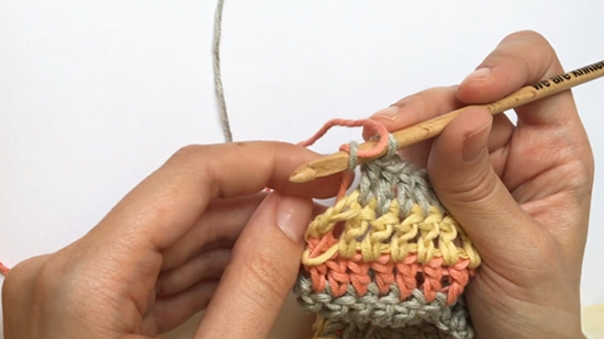 1. Insert the crochet hook into the stitch of the previous row as indicated in the pattern.