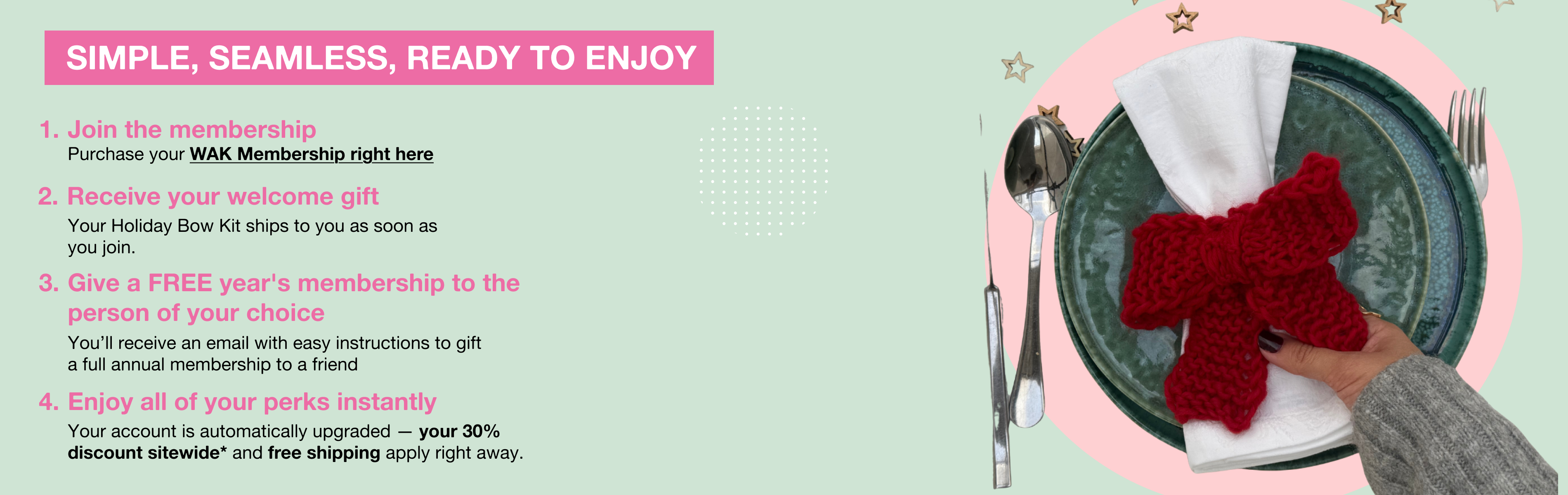 You’ll receive our Holiday Bow Knitting Kit—a beginner-friendly kit to learn how to create a cute, multi-use bow, perfect for the holiday season.