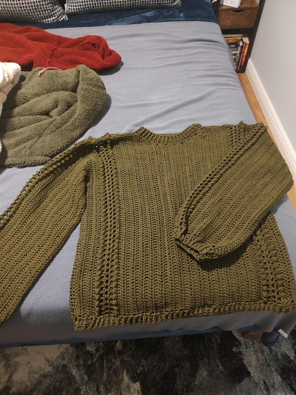 The Sunday Sweater is an intermediate level crochet project, the pattern includes both written and charted instructions. This project is crocheted in several pieces which are then seamed together: back, front, and sleeves. The body is worked from side to side, and the sleeves are worked widthwise, so that the stitch direction is horizontal to the body. Once the pieces are crocheted, you will finish the piece, working in the round along the bottom edge and along the neck of the piece.